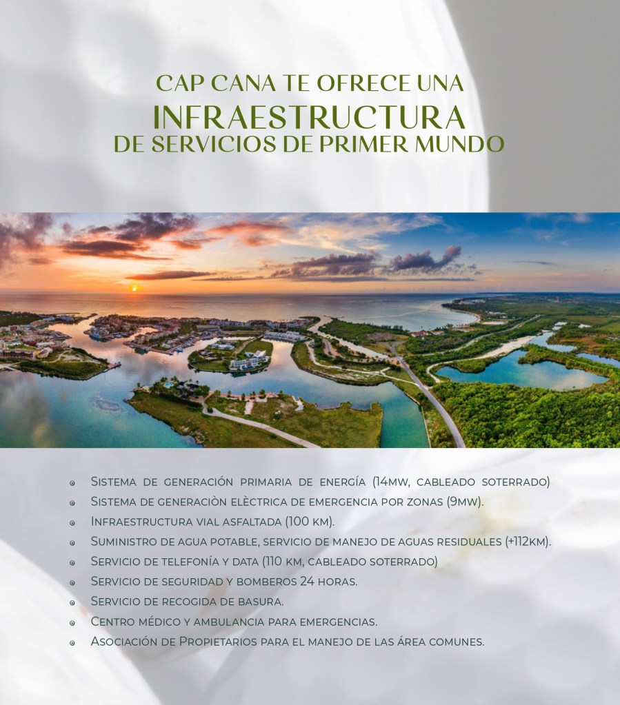 Cap Cana te ofrece una infraestructura de servicios de primer mundo: sistema de generación eléctrica, infraestructura vial asfaltada, suministro de agua potable, telefonía y data, seguridad y bomberos 24 horas y centro médico y ambulancia. Todos los servicios para poder disfrutar con la familia en un enclave paradisíaco con toda la tranquilidad del entorno.